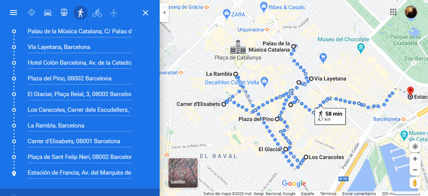 1.- Palau de la música; 2.- Via Laietana: Comissaria; 3.- Hotel Colon; 4.- Catedral; 5.- Plaça del Pi; 6.- Plaça Reial; 7.- Los caracoles; 8.- Les Rambles; 9.- Cafè de l'Òpera; 10.- Liceu; 11.- Mercat de la Boqueria; 12.- Carrer Elisabets; 13.- Plaça Sant Felip Neri; 14.- Església dels sants Just i Pastor; 15.- Estació de França